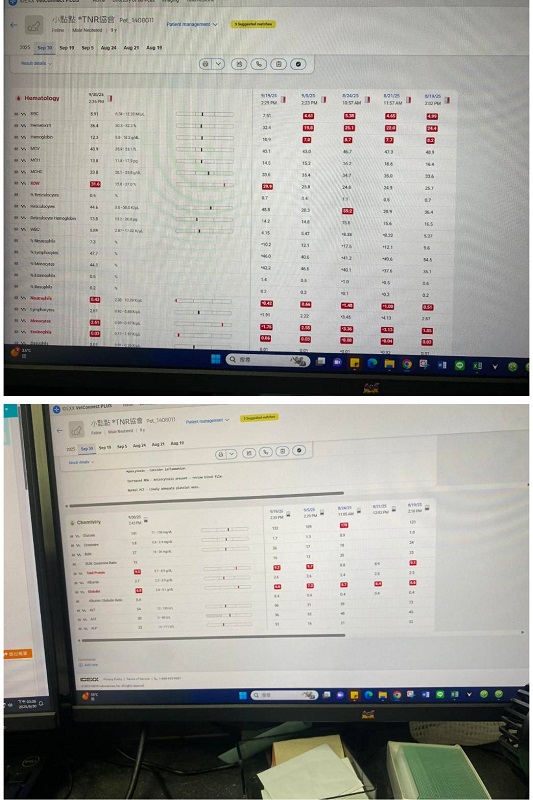 近期於2025年9月19回診觸診皮膚狀況還好,耳朵稍紅,要搭配血檢看紅血球的狀況。