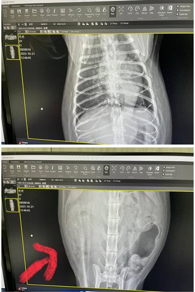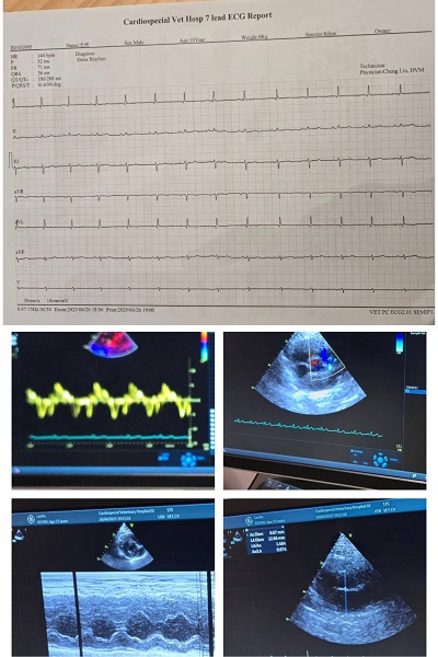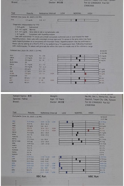 2025年6月2日回診的皮膚改善不夠理想、要更換黴菌藥,也還有些小顆粒要繼續刷洗,比較讓人擔心的是除了肝指數升高,紅血球及血容比持續下降,懷疑體內有其他地方在出血,因此在2025年6月16日回診的紅血球仍在下降及白血球也開始下降時,做超音波及X光檢查進一步查看,結果發現心臟尺寸較大,再加驗心臟快篩結果異常,且脾臟也有腫大、右腎上方有一個跟腎臟本身一樣大的腫瘤。