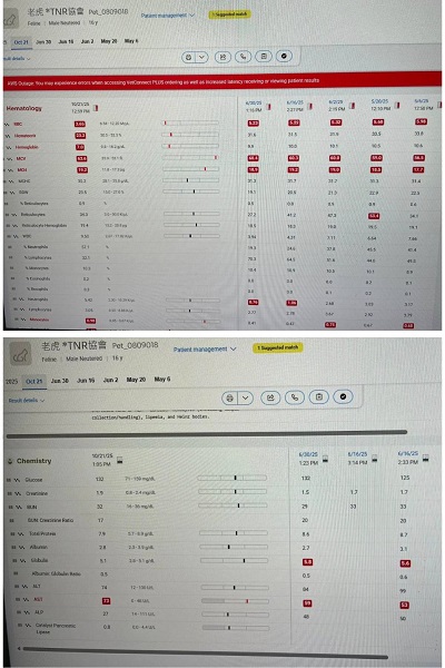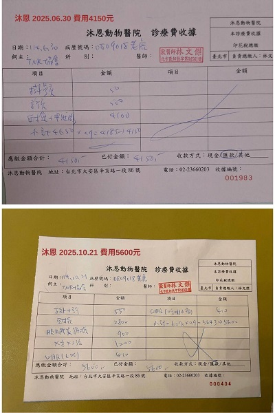至目前老虎的精神食慾尚可,但已來到末期的安寧照護,只希望盡可能讓老虎在最後階段能減緩身體的不適。本筆醫助是2025年6月26日於專心醫院及2025年6月30日至2025年10月21日間於沐恩醫院的費用,包含血檢、超音波、X光及用藥。