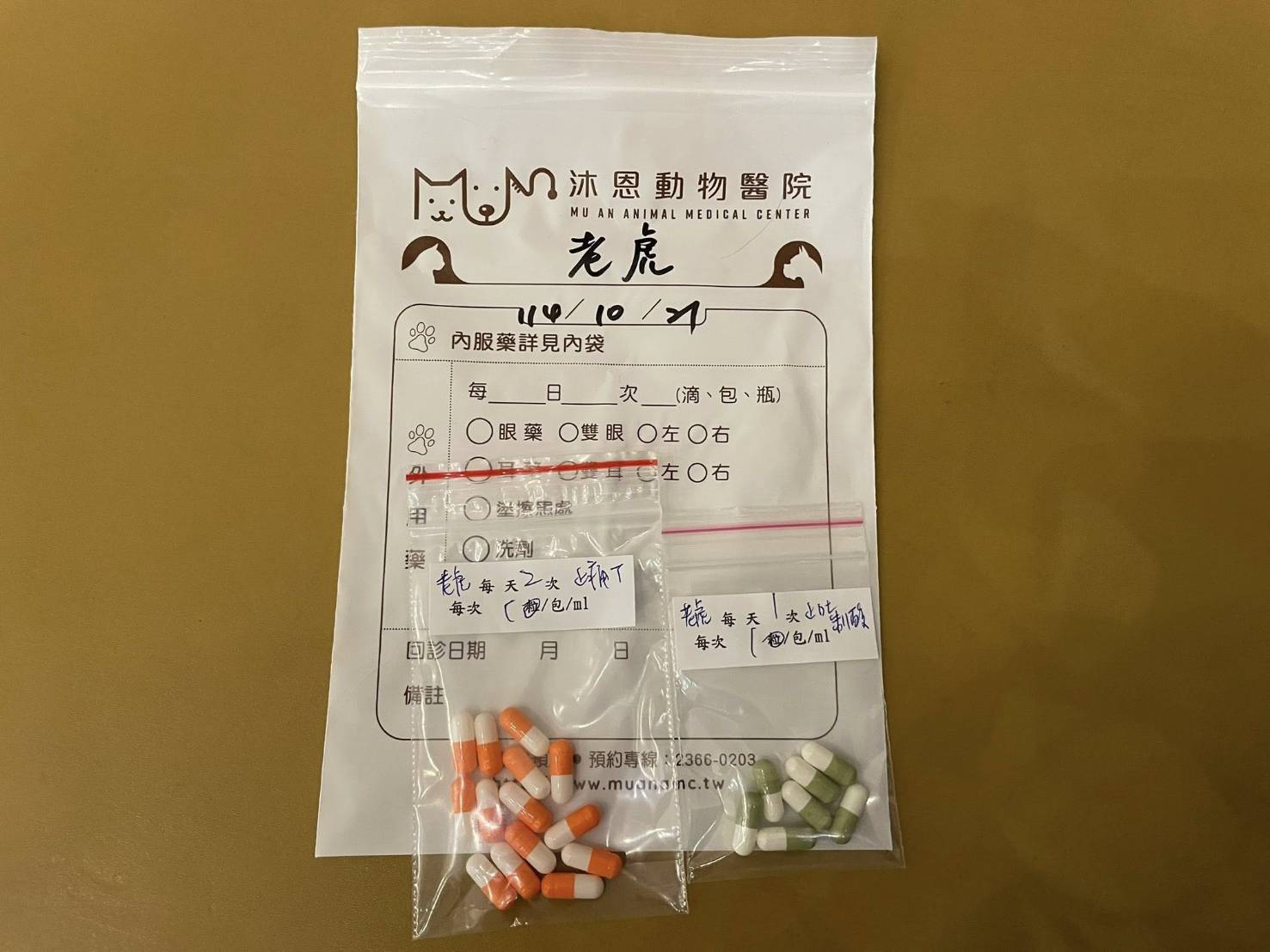 2025年10月因老虎瞳孔放大精神狀況不佳而於同月21日回診,目前體重下降有些快但目前食慾精神還算穩定,還沒有出現症狀,右腎腫瘤過大問題採安寧照護,暫時也不需要回診,有食慾不好的狀況,可再回診拿類固醇跟止痛等藥物舒緩。若狀況持續變差則可向醫院領取嗎啡貼片及止痛藥。