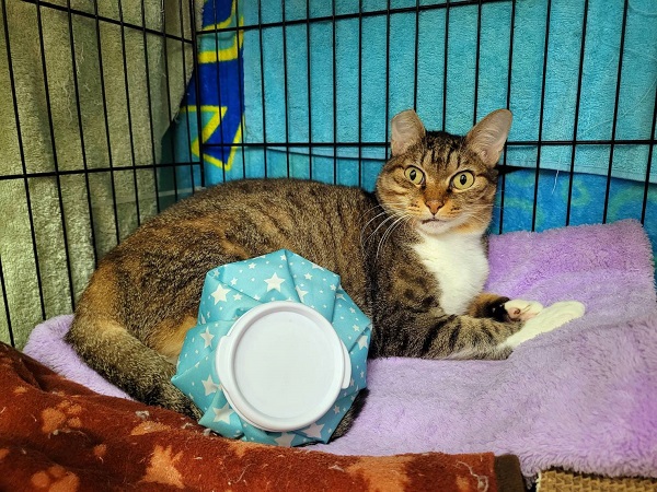 住院至2024年6月11日,羅賓已可自己吃足夠的飯,不須再裝餵食管,也能前手支撐自行移動爬至貓砂盆大小便,右後腳背處傷口已癒合,也不需再清潔換包紮,當天辦理出院接回安養之家照顧。
