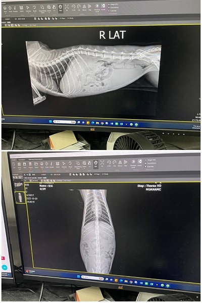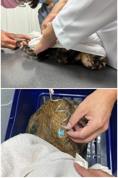 ,且有脫水症狀,在沐恩先打皮下200ml, 腹部超音波無腹水,X光 正常,口腔正常,需先觀察有沒有吐、拉肚子。如可以的話,可帶糞便來檢驗,看有無寄生蟲。後再於同月27號回診, 尿檢後發現腎及肝有發炎,且輸尿管不順,評估可能有潛在病毒或細菌感染,先使用抗生素治療若無嘔吐再餵驅蟲藥。