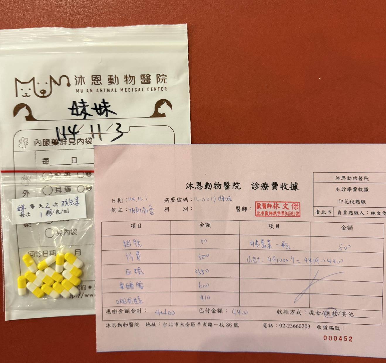 目前妹妹在台北安養之家這段時間, 已可以看見她逐漸放鬆適應, 只要呼喚她都會溫柔的回應,希望能讓妹妹的老年生活穩定控制病情。本筆醫助是妹妹自2025年10月20日至2025年11月3日間於沐恩醫院的費用,包含血檢、X光、超音波及用藥等等。
