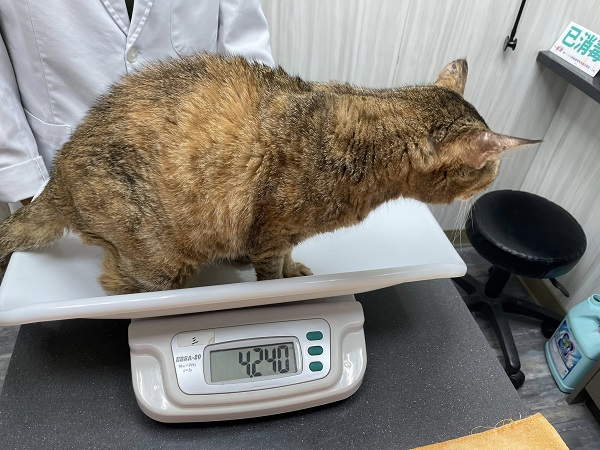 在2024年1月間阿咪因體型明顯變瘦,於2024年1月5日至沐恩醫院檢查,血檢結果腎指數及肝指數都高、有些脫水,口腔檢查發現左上犬齒牙齦腫起一包並有一個小傷口,X光檢查胸腔腹腔沒有明顯異常,整體檢查結果,主要是腎衰及牙周問題,只是在脫水及腎臟問題未處理好之前,不宜接受麻醉手術,所以先打皮下輸液、吃食促,二週後回診紅血球指數下降及磷上升指數,增加打造血針及吃降磷藥,治療至內科狀況較為穩定後,於2024年3月19日進行牙周手術,因腎指數仍是較高、麻醉手術不宜過長時間,所以手術只拔除狀況較差的四顆牙齒,完成牙周手術後仍持續回診治療肝腎指數問題,為了幫助阿咪的健康能更穩定,也開始做胜肽治療。