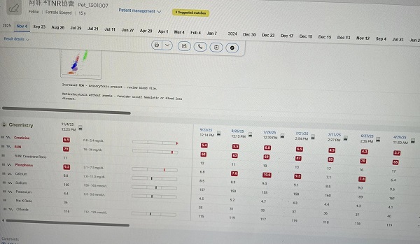 2025年7月29日因磷指數持續上升降磷藥劑量加倍,改為早晚各2顆。因阿咪指數上升緩慢無大礙其他藥先照舊,加磷看能不能降磷指數,需注意排尿與精神狀況。若皮下未吸收、精神食慾變差,需提早回報看是否提早回診。2025年8月26日回診,血檢結果良好,持續保持用藥。