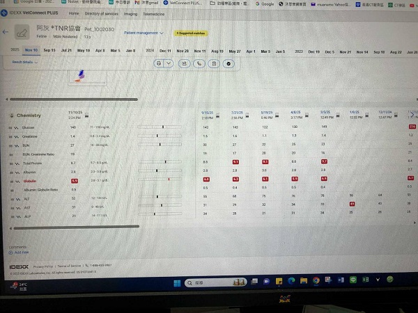 近期於2025年11月10日於沐恩回診,黴菌情況增加,新增黴菌藥。右前腳內側舔傷部分不需要刷洗,新增抗生素。口腔檢查,與上次狀況持平,免疫球蛋白指數有偏高需再持續觀察。