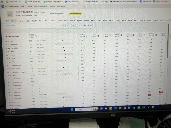 2025年7月21日,皮膚檢查,狀況OK。口腔檢查舌頭上有潰瘍且口腔有紅腫。今日進行胜肽治療,看能不能改善口炎與皮膚狀況。血檢部分指數都正常。