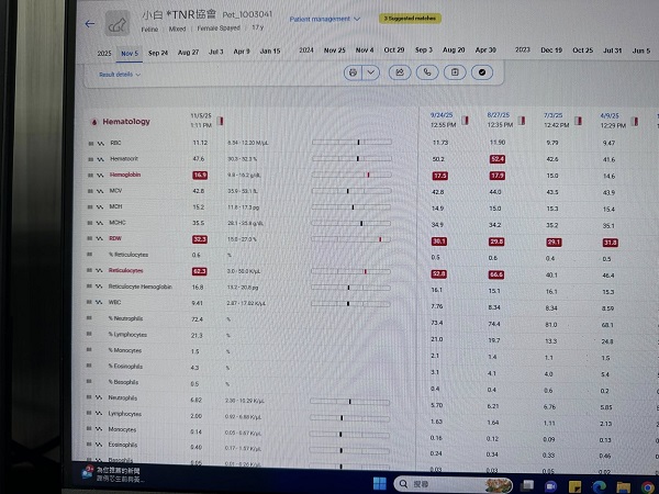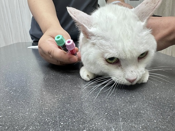 2024年8月回診,腎指數又開始升高,開始打皮下輸液,但兩個月後回診的腎指數還是繼續上升,紅血球指數也下降、血壓稍高,要打造血針與吃血擴藥,為讓小白的健康更穩定,開始給予胜肽治療,至2025年1月回診,血壓已經恢復正常數值、體重回升,腎指數仍高於標準但沒有再上升、紅血球指數回升,口腔狀況良好,整體檢查結果有進步,可以延長回診時間,期間回報及取藥即可。
