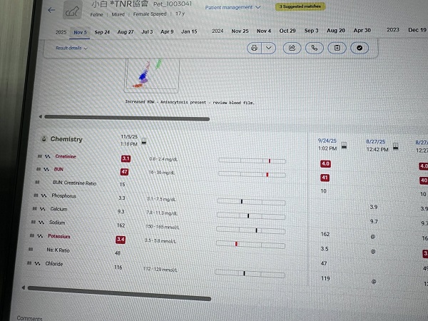 小白是很漂亮的純白貓咪美女,目前食慾精神都很穩定,因關節退化問題,走路看起來是踩著小碎步,相當可愛,照護員每天持續讓她吃關節保養品控制關節退化,也每週測量體重紀錄,只是畢竟小白年紀已大,腎臟功能的衰退是不可逆,只希望經由用藥能延緩病情及維持生活品質,本筆醫助是2025年11月5日間於沐恩醫院的費用,包含回診血檢及用藥等等。