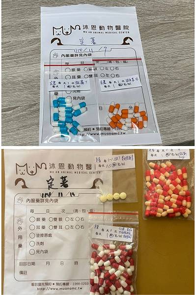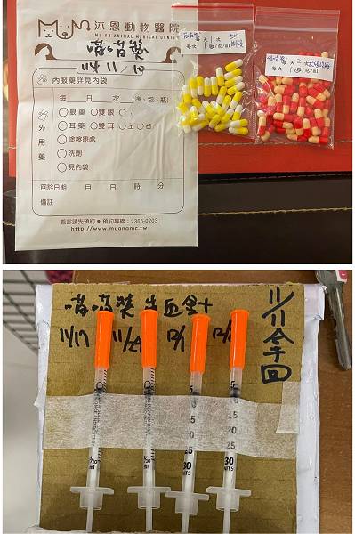 只是在7月11日喵喵醬又出現嘔吐,回報沐恩醫院後,因食慾仍還可以,所以先拿回止吐針劑,加入皮下輸液一起打,打完後幾日喵喵醬沒有再出現嘔吐,但食慾方面仍不是很穩定,照護員保持每天仔細觀察以回報醫師。