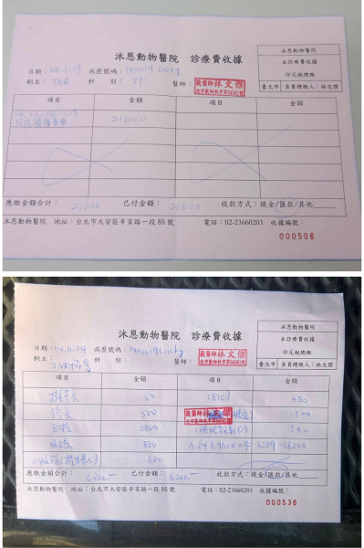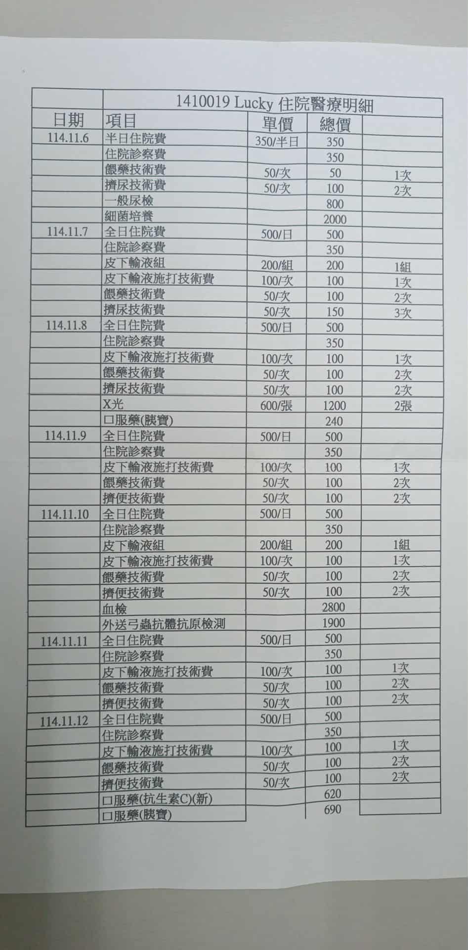 後又於2025年11月24日回診,白血球指數可能跟他肺部之前感染有關係,不大影響。但腎指數有點高,需吃腎處方飼料。目前已會自行翻身但仍注意定時查看避面免過長時間都躺同一側造成褥瘡。本筆醫助為2025年11月6日至2025年11月24日於沐恩醫院的費用,包含回診住院,檢驗,血檢及用藥。