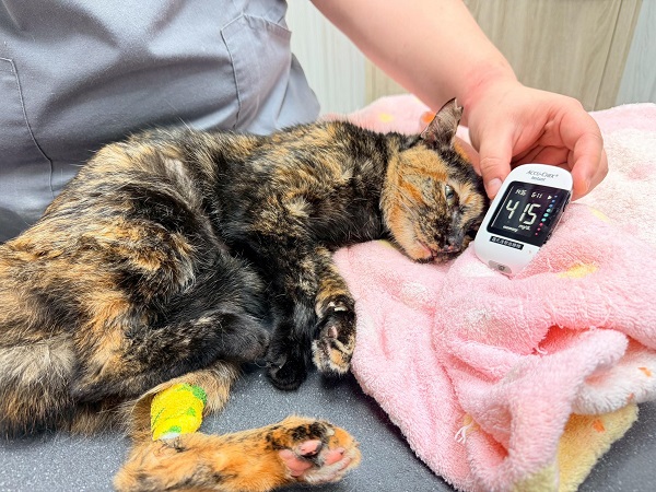 ,且有脫水症狀,在沐恩先打皮下200ml, 腹部超音波無腹水,X光 正常,口腔正常,需先觀察有沒有吐、拉肚子。如可以的話,可帶糞便來檢驗,看有無寄生蟲。後再於同月27號回診, 尿檢後發現腎及肝有發炎,且輸尿管不順,評估可能有潛在病毒或細菌感染,先使用抗生素治療若無嘔吐再餵驅蟲藥。