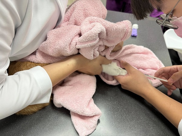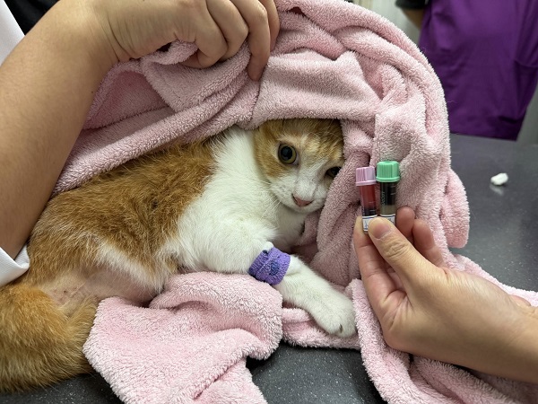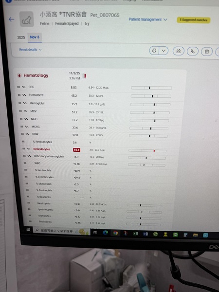 亞太周醫師先為小酒窩進行血檢準備妥當後即進行截肢手術,當日同時糞檢發現體內很多寄生蟲、二合一檢驗白血/愛滋陰性。