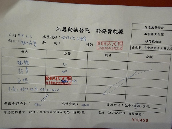 多年的安養照顧小酒窩一直都算健健康康,但在近期2025年11月發現小酒窩多日連續又吐又拉,於是在2025年11月3日安排於沐恩醫院看診,血檢結果指數正常,研判是吃壞食物或腸胃炎,先行早晚餵食胃乳,若腹瀉嚴重持續嚴重再提供半顆止瀉藥。目前小酒窩狀況已好轉。本筆醫助是小酒窩於2025年11月3日在沐恩醫院回診的費用,包含看診血檢及用藥等。
