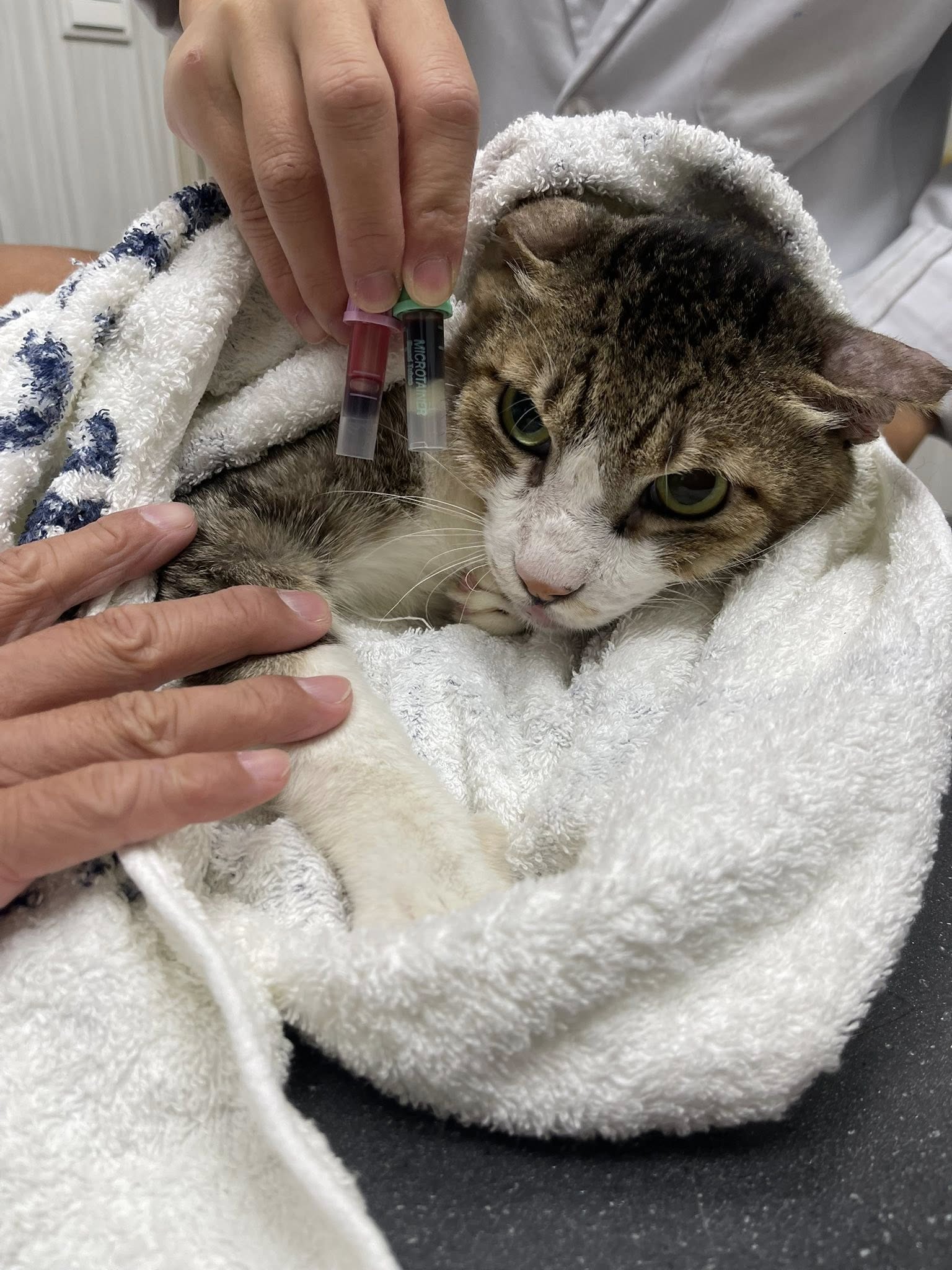 貓咪病情複雜,醫生們懷疑是腫瘤問題,於是7月初寫信向協會尋求幫助,目前已於合作醫院長青進行各項檢測,並於楊動物醫院住院照護中。經檢測,無腫瘤活躍細胞,細菌培養亦無細菌感染,已再進一步另做細菌切片染色檢測。第一階段報告結果,醫師認為,下巴跟頸部後側莫名腫大的原因,跟貓愛滋發病有關。目前投以抗生素、造血針治療中。