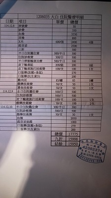 2025年12月19日回診沐恩醫院,腎指數輕微上升,但是體重也有上升,林醫師還是建議要掃CT,等有確定要掃再來約。本筆醫助是自2025年12月8日至2025年12月19日於沐恩醫院的費用,包含看診住院、血檢、超音波及用藥等等。