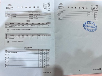 2025年11月25日回診,此次體重增加突然變胖太多,醫師擔心有糖尿病徵兆,但上回有驗過果糖胺是正常,所以這次沒有驗,下次回診如果體重上升會再評估加驗。有與醫師討論,仁愛這幾週食慾並沒有特別變很好,但還是會自己主動吃,因此建議先從照護員灌食飼料泥減量開始。有稍微貧血但還不需要打造血針先吃倍補血保養。淋巴結有稍微變大,但在預期範圍。黴菌患處也好很多。