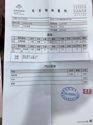 目前妙咪皮膚狀況維持得不錯,因擔心舔毛會誘發癲癇,所以仍須穿著防護衣及戴頭套,治療至今,癲癇發作次數及時間有明顯減少很多,但妙咪的癲癇仍可能會是需要終身吃藥;可憐的妙咪因被壞人傷害造成皮膚相當敏脆弱,並因此造成發作癲癇,還好有協會的救援與安置,讓妙咪能夠有機會接受最好的醫療與照護,妙咪的醫療用藥是終身需求,本筆醫助是自2025年12月2日間,至長青醫院取癲癇、止癢用藥的費用。