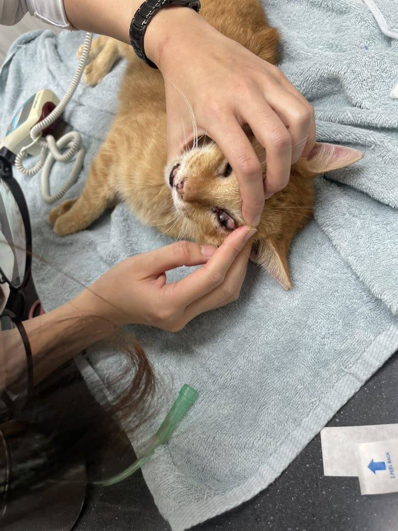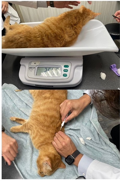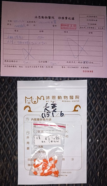 在外面找大黃半天,大白叫到喉嚨都要破了,工作人員告知在後面的儲物區塑膠抽屜上,發現躲在紙箱後面不動的大黃...不知道是不是生病了?於是拿網子圍捕,捕抓送醫檢查。就醫檢查有發炎現象,因捕抓不易、順便檢查胸腔、口腔有無問題並進行拔牙,後因為下痢及精神與食慾都不佳,住院治療近三週,狀況穩定後出院接回安養之家照顧。在苗栗安養之家居住多年,因發現大黃體型消瘦且淚眼不斷,因此隨著苗栗貓屋全數遷移回台北安養之家時,一併安排就醫檢查,在2025年12月30日於沐恩醫院看診發現,大黃有一邊腎偏小,血檢結果為腎衰,在醫院當下便先行施打乳酸林格100ml,目前先回去觀察進食狀況,1月開始需全面將飲食改為腎處方飼料並給予食慾促進劑看是否能將食慾提升。同時因大黃有淚眼鼻涕狀況需每天噴霧舒緩症狀。本筆醫助是大黃自2025年12月1日至2026年1月6日間,於沐恩醫院看診的費用,包含血檢及用藥。