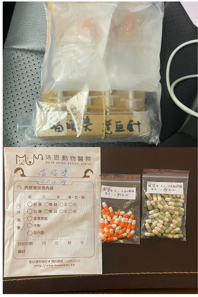 只是在7月11日喵喵醬又出現嘔吐,回報沐恩醫院後,因食慾仍還可以,所以先拿回止吐針劑,加入皮下輸液一起打,打完後幾日喵喵醬沒有再出現嘔吐,但食慾方面仍不是很穩定,照護員保持每天仔細觀察以回報醫師。
