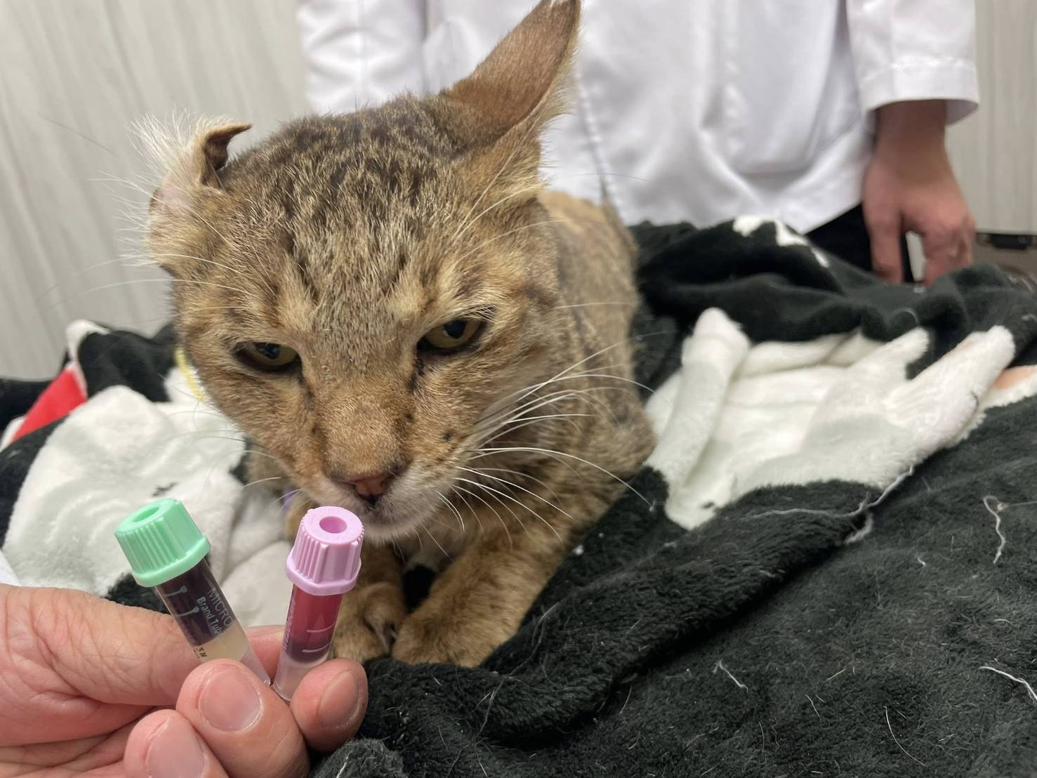 血檢結果愛滋白血二合一為陰性,耳朵因感染酵母菌及耳疥蟲導致耳血腫,還有脫水、貧血、嚴重口炎,又因上呼吸道嚴重感染導致帶血濃鼻涕,因阿灰原本生活地區的貓咪已有數例為愛滋及血巴東,所以再送驗血巴東檢查,幸好收到報告後血巴東是陰性,因此研判貧血原因可能是跳蚤太多及營養不良,住院期間又發現有毛囊蟲,打針及吃藥至狀況穩定做了耳血腫治療的手術,住院近一個月時間、狀況較為穩定,辦理出院接回安養之家,在內科方面治療至較為穩定、為了改善口炎情況,於2022年3月22日進行牙周手術全口拔牙。
