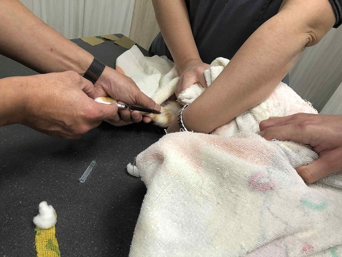 糕糕自2021年10月回診開始出現肝指數升高,超音波檢查結果肝臟本身沒有問題、胰臟有小小的黑洞影像,開始吃肝藥及酵素,後來又發現腸道淋巴結出現腫大情形,2022年4月間超音波檢查胰臟發炎及胰臟旁邊淋巴結腫大,細針採樣抹片查看結果是有活躍的淋巴細胞,但還沒有大到癌化細胞的程度,2022年8月胰臟與12指腸間的團塊影像變大,對照以往超音波紀錄,此團塊也曾出現忽大忽小的情況,但在體重沒有變輕的情況下,或許團塊只是淋巴結腫或是良性瘤,因為團塊與肝指數的變化情況類似,懷疑可能是食物引起,開始打皮下輸液,一個月後回診的肝指數有下降了,因此研判先前肝指數過高可能是環境因素暫時影響,而腹部腫塊屬發炎性,跟肝指過高應沒關係,之後持續的回診,肝指數仍是高於正常值,腸繫膜淋巴結腫也仍一直存在,雖沒有出現像惡性腫瘤的變化,但醫師仍不能排除淋巴癌的可能性,要確定必須開腹探查,但協會考量到糕糕個性極為緊張,每次看診都要蓋住大毛巾才能進行,所以開腹探查手術過程造成的傷口或是住院,會讓糕糕疼痛及造成很大緊迫,所以只要糕糕精神食慾都穩定,就不手術、再觀察看看,維持吃藥控制的方式及定期回診做檢查。