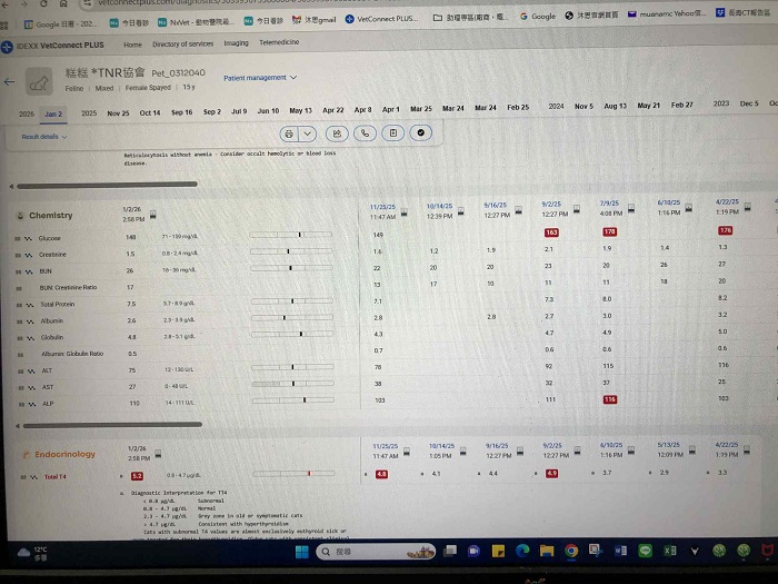 2025年4月1日回診,肝腎指數都正常,紅血球低、白血球高,超音波檢查胸腹部都有一點水,因此呼吸還是稍微比較用力,醫師先幫糕糕打利尿劑希望可以排出水,另外建議再至心臟科看看目前心臟狀況,以作為日後的用藥的評估,因此於2025年4月1日至心臟專科專心醫院檢查,經過心臟超音波及心電圖、聽診、測量血壓等檢查後,檢查結果有明顯心雜音、心律不整程度提高、左心房擴大並有胸水,心臟科醫師有提出其他用藥的建議,並建議糕糕要做甲狀腺指數檢查,因若有甲狀腺問題是會影響心臟及肝臟,完成心臟科檢查後將報告轉達沐恩醫院,2025年4月至2025年6月於沐恩的回診,紅白血球及肝腎指數、甲狀腺都正常、超音波檢查也逐漸沒有胸水了,心臟跳動雖然偶有漏一拍但也比之前較有力,體重也有維持。