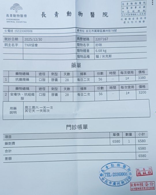 目前妙咪皮膚狀況維持得不錯,因擔心舔毛會誘發癲癇,所以仍須穿著防護衣及戴頭套,治療至今,癲癇發作次數及時間有明顯減少很多,但妙咪的癲癇仍可能會是需要終身吃藥;可憐的妙咪因被壞人傷害造成皮膚相當敏脆弱,並因此造成發作癲癇,還好有協會的救援與安置,讓妙咪能夠有機會接受最好的醫療與照護,妙咪的醫療用藥是終身需求,本筆醫助是自2026年1月1日間至長青醫院取癲癇、止癢用藥的費用。