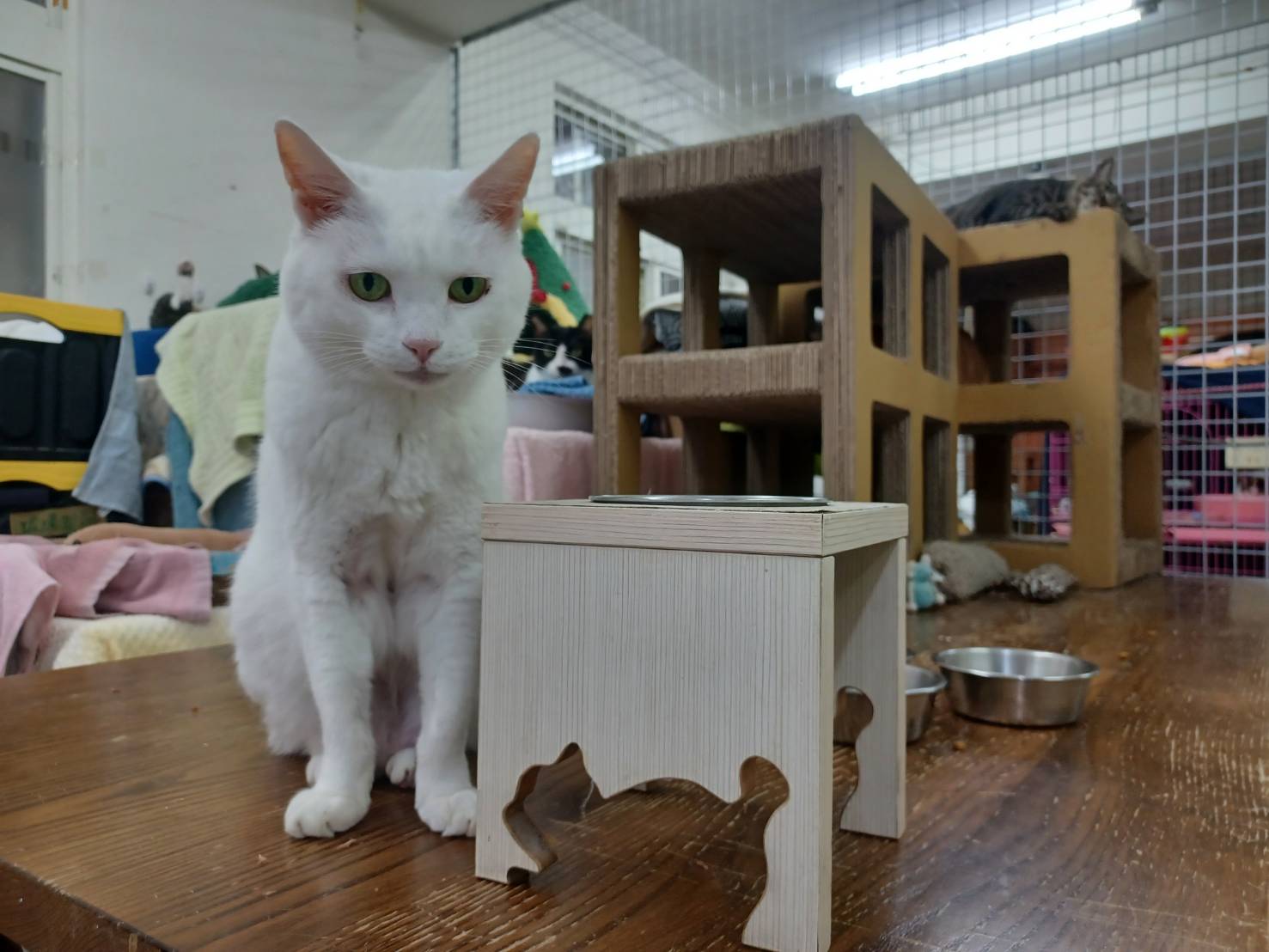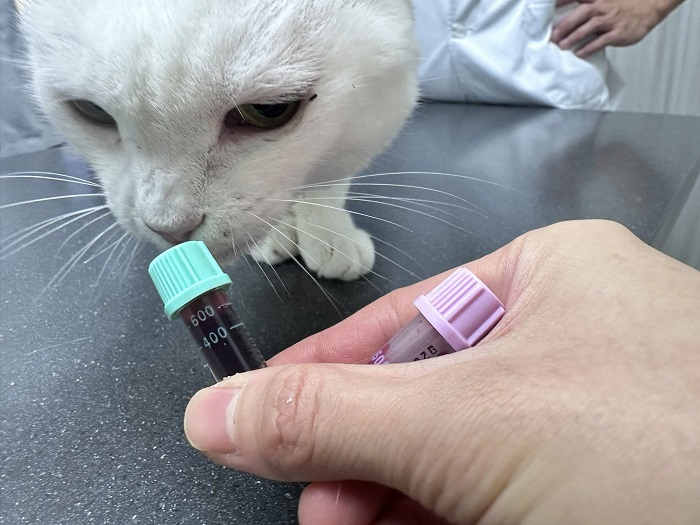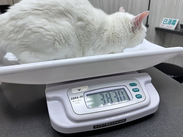 2024年8月回診,腎指數又開始升高,開始打皮下輸液,但兩個月後回診的腎指數還是繼續上升,紅血球指數也下降、血壓稍高,要打造血針與吃血擴藥,為讓小白的健康更穩定,開始給予胜肽治療,至2025年1月回診,血壓已經恢復正常數值、體重回升,腎指數仍高於標準但沒有再上升、紅血球指數回升,口腔狀況良好,整體檢查結果有進步,可以延長回診時間,期間回報及取藥即可。