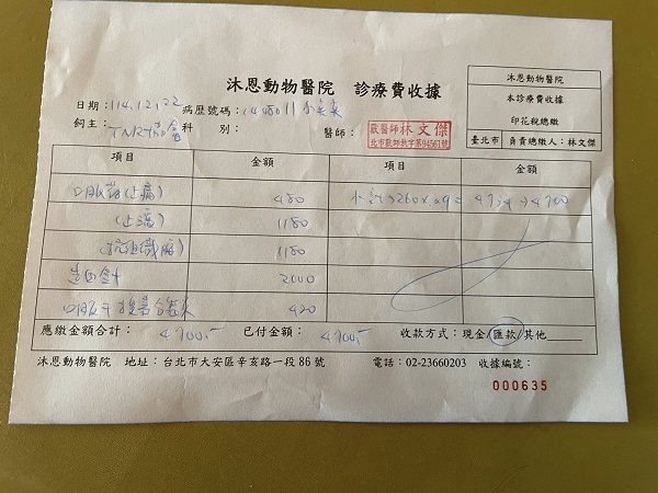 2025年10月16日於沐恩看診,因病毒感染長期無法抑制,所以耳朵及嘴巴總是會持續紅腫,需加強清潔保持乾淨。紅血球與球蛋白皆超出標準範圍,同時也須注意精神食慾狀況,若變差則需要儘速與醫院連繫回診。