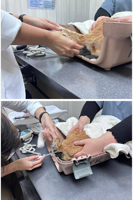 2025年2月間的回診肝指數終於有下降,但是在懷疑肝臟有長東西的情況下,肝指數應該是要比較高的,因體重有維持,就先觀察看看,另外因食慾不很穩定,開始吃食慾促進劑,原本可以四個月後再回診,但2025年3月24日糕糕突然出現呼吸急促、吐舌頭,臨時至沐恩醫院回診,因須仔細檢查、擔心造成糕糕過於緊迫,因此在鎮定後才進行檢查,血檢無特別異常,X光檢查及超音波檢查結果,發現有胸水及肺水腫,醫師將右胸水抽出大約70ml,糕糕在氧氣室休息,因呼吸還是用力及上膀胱發現有泡尿沒尿出來,所以當天先住院觀察治療、持續吸氧及給予利尿劑還有心臟用藥,醫師表示糕糕的心臟循環較差,肺葉後面有看到2顆不確定是不是腫瘤的東西,但也可能只是發炎,在調整用藥後,糕糕情況有比較穩定、2025年3月27日辦理出院。