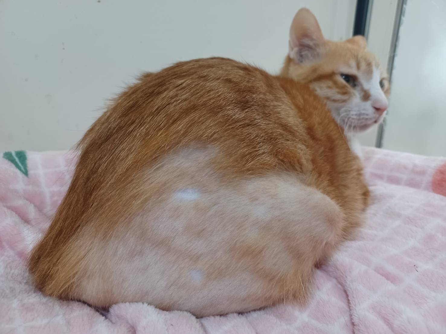 自2021年4月間開始,咪兔出現頻舔下半身造成禿毛及皮膚上許多小紅疹,先給體內驅蟲以排除寄生蟲原因,並吃抗組織胺及放鬆情緒的藥物,但後來連肚皮上也有紅疹,於是醫師開始給予類固醇,狀況才有些改善,經過一年多的治療及用藥調整,類固醇劑量也逐漸降低,至2022年10月間禿毛處開始長出新毛,血檢結果也良好,沒有因吃類固醇受到影響,可以延長回診定期取藥即可。