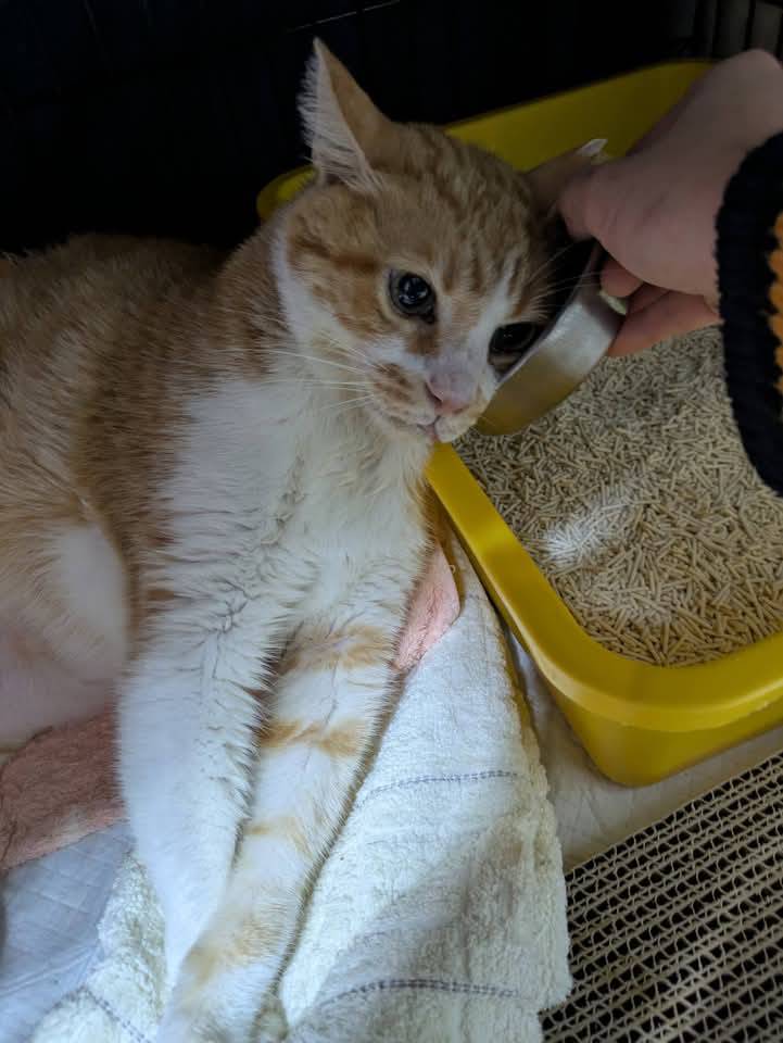 2025年2月間的回診肝指數終於有下降,但是在懷疑肝臟有長東西的情況下,肝指數應該是要比較高的,因體重有維持,就先觀察看看,另外因食慾不很穩定,開始吃食慾促進劑,原本可以四個月後再回診,但2025年3月24日糕糕突然出現呼吸急促、吐舌頭,臨時至沐恩醫院回診,因須仔細檢查、擔心造成糕糕過於緊迫,因此在鎮定後才進行檢查,血檢無特別異常,X光檢查及超音波檢查結果,發現有胸水及肺水腫,醫師將右胸水抽出大約70ml,糕糕在氧氣室休息,因呼吸還是用力及上膀胱發現有泡尿沒尿出來,所以當天先住院觀察治療、持續吸氧及給予利尿劑還有心臟用藥,醫師表示糕糕的心臟循環較差,肺葉後面有看到2顆不確定是不是腫瘤的東西,但也可能只是發炎,在調整用藥後,糕糕情況有比較穩定、2025年3月27日辦理出院。