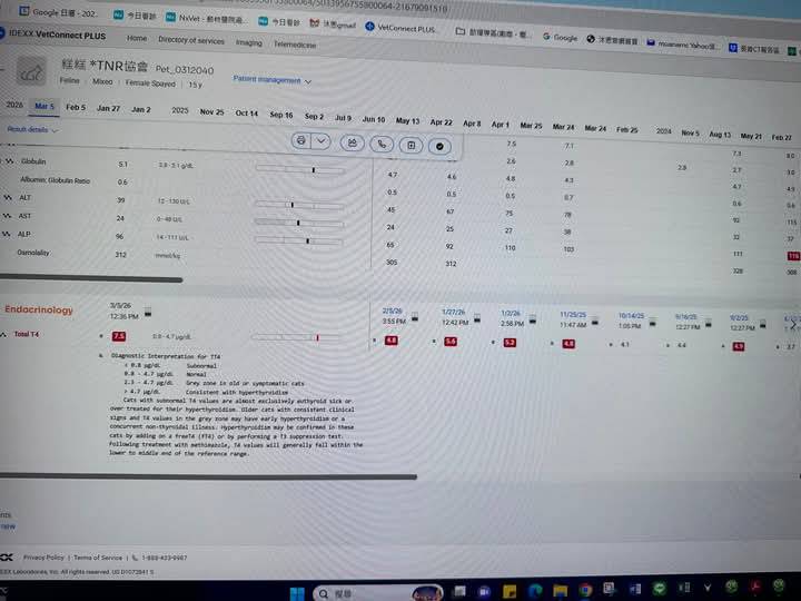 2026年1月7日於沐恩回診,血檢結果甲狀腺素偏高需持續追蹤觀察,因此甲亢藥加劑量,其他狀況及用藥持平。2026年2月初因糕糕連續兩天食慾下降且又吐又拉,因此安排2026年2月5日於沐恩醫院看診,體溫正常無發燒,超音波檢查發現腸道腫瘤有變大的趨勢,但病狀較像是腸胃炎與腫瘤無關, 左邊腎臟有新增疑似腫瘤影像需要再持續觀察,食慾下降部分先少量且分次灌食,因怕又會吐。在醫院已先施打了林格75+止吐制酸。