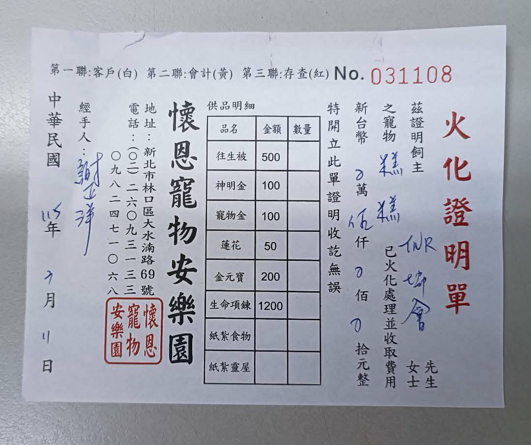 但就在3月11日一早照護員發現糕糕發出類似打嗝聲音,因此先給予吸氧並直接安排於沐恩回診,在醫院時發現是肺水腫造成呼吸困難,不忍糕糕這麼痛苦因此最後決定陪伴他走過最後一程,也祝福糕糕終於離苦得樂。本筆醫助是2026年3月5日至2026年3月9日間於沐恩醫院的費用,包含看診、血檢及用藥。及最後一筆2026年3月11日於懷恩寵物安樂園的火化費用。