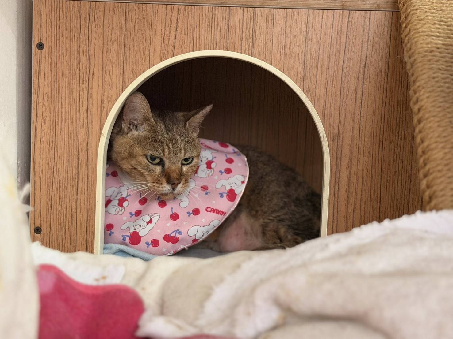 剛來到安養之家前兩年的仁愛幾乎是看不到也摸不到,照護員細心呵護及安撫加上發現每天不用辛苦覓食就有好多好吃的飯飯,讓仁愛漸漸卸下心防,終於願意親近照護員也變得很撒嬌,幾年下來,舒適的環境、營養好吃的食物讓仁愛的體型越來越圓潤,模樣也越來越可愛。