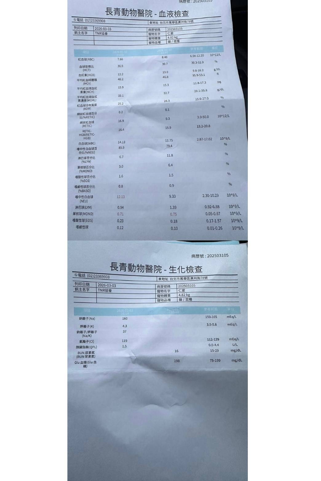 2025年11月25日回診,此次體重增加突然變胖太多,醫師擔心有糖尿病徵兆,但上回有驗過果糖胺是正常,所以這次沒有驗,下次回診如果體重上升會再評估加驗。有與醫師討論,仁愛這幾週食慾並沒有特別變很好,但還是會自己主動吃,因此建議先從照護員灌食飼料泥減量開始。有稍微貧血但還不需要打造血針先吃倍補血保養。淋巴結有稍微變大,但在預期範圍。黴菌患處也好很多。