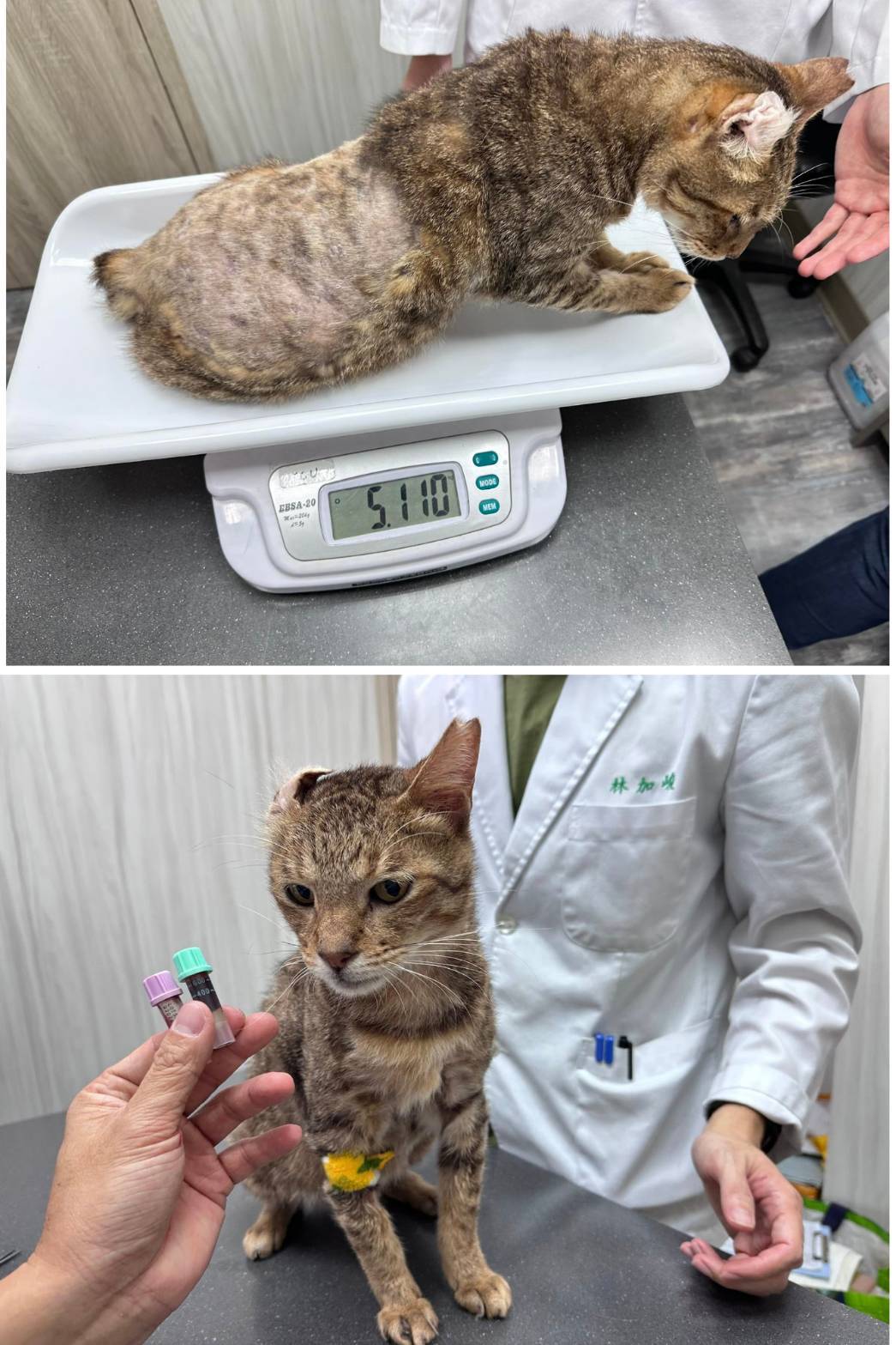 數例為愛滋及血巴東,所以再送驗血巴東檢查,幸好收到報告後血巴東是陰性,因此研判貧血原因可能是跳蚤太多及營養不良,住院期間又發現有毛囊蟲,打針及吃藥至狀況穩定做了耳血腫治療的手術,住院近一個月時間、狀況較為穩定,辦理出院接回安養之家,在內科方面治療至較為穩定、為了改善口炎情況,於2022年3月22日進行牙周手術全口拔牙。