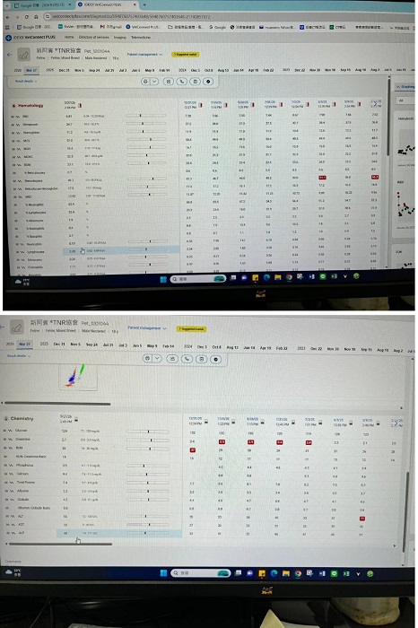 2023年8月間的回診因血檢腎指數升高開始打皮下輸液,還好兩週後回診指數有降下來,但為避免變化,還是需要持續打;2024年10月間為讓新阿賓的健康能更為穩定,開始給予胜肽治療,隨著病情改善也可逐漸延長回診時間。