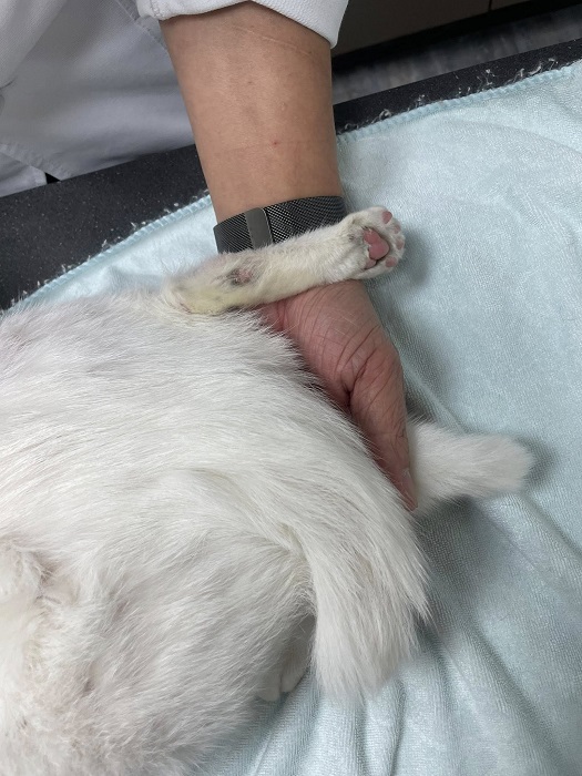 Ganza白是靠近腳踝的關節處骨折,因小貓骨頭軟,手術介入效果不會很理想,住院期間做血巴東蟲檢驗為陰性、愛滋白血二合一陰性,也有吃體內驅蟲藥,10月27日狀況較為穩定,出院住進安養之家照護。