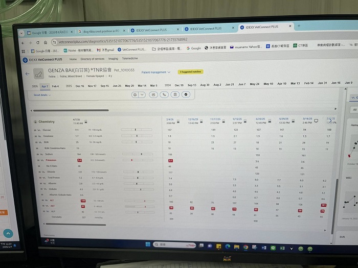 2026年4月7日於沐恩回診,血檢報告鉀離子指數有回來,用藥照舊即可。其他血檢狀況基本上都還算維持不錯。白甘蔗後腳新增那個一樣黴菌就剃毛保持傷口乾淨就好。