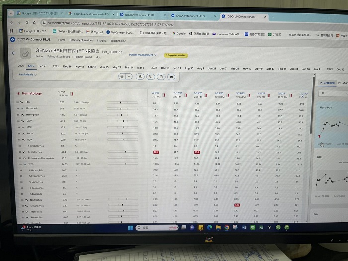 因小白多日有嘔吐狀況所以在2026年2月4日於沐恩回診,血檢顯示胰臟炎陰性但鉀離子低,是因沒吃東西造成。造血指數高為有正常造血,先在醫院打林格氏150cc及制酸針、止吐針,醫師表示若持續未自主進食需灌食,早晚10g 飼料粉加胰寶半顆及20cc水,目前白甘蔗已逐漸恢復正常。