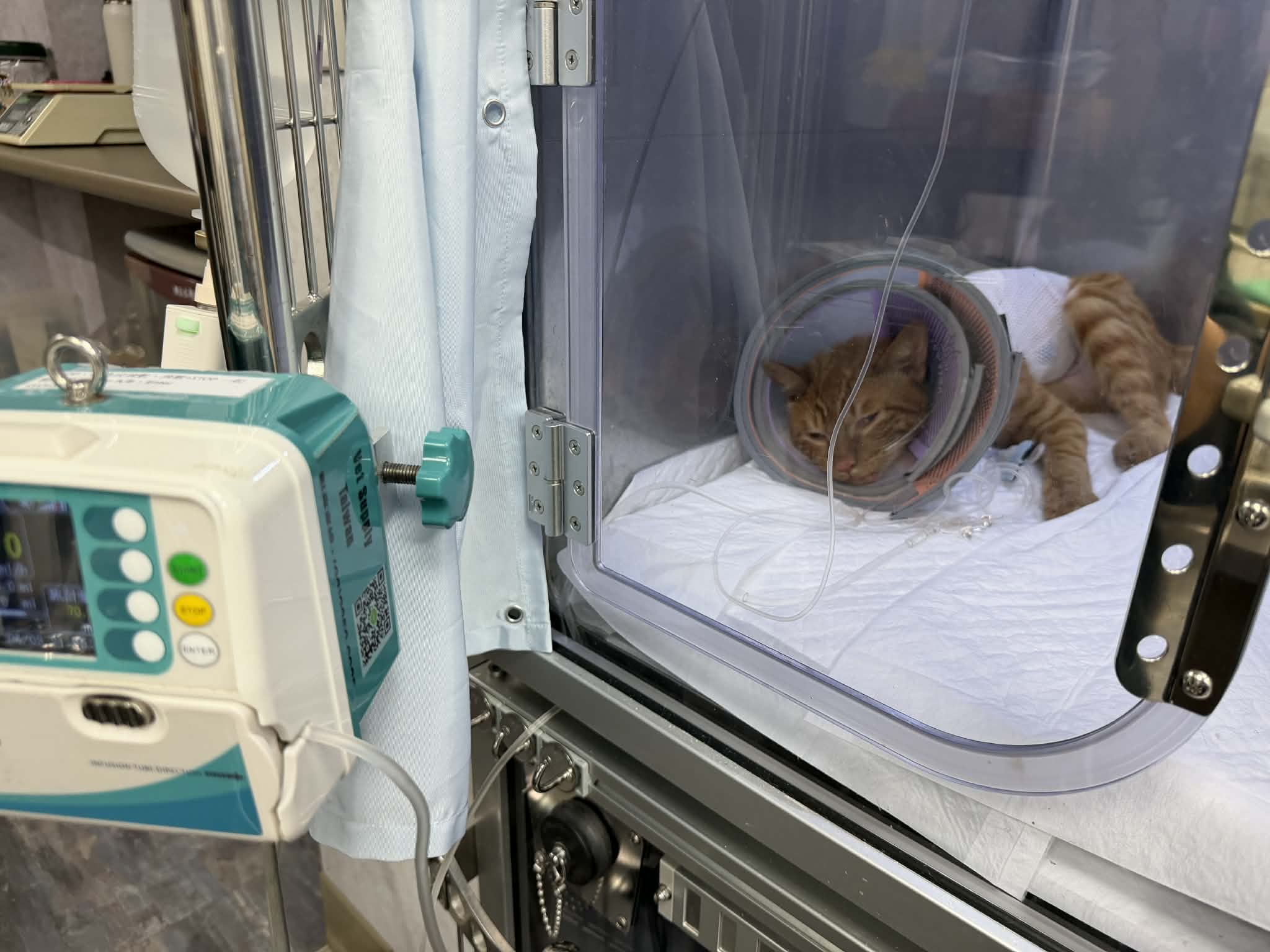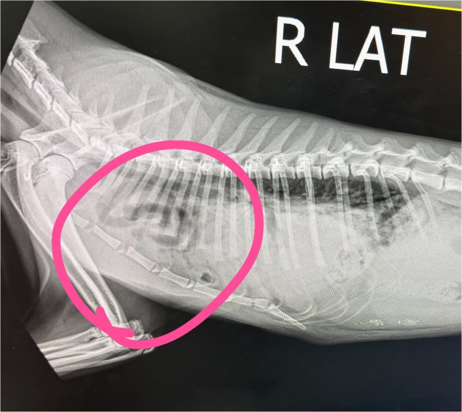 經X光發現,貓咪胸腔橫格膜破裂,小腸已全部位移至胸腔、連肝臟也180度位移,貓咪呼吸極喘,先住氧氣室休護一天後,立即安排手術。