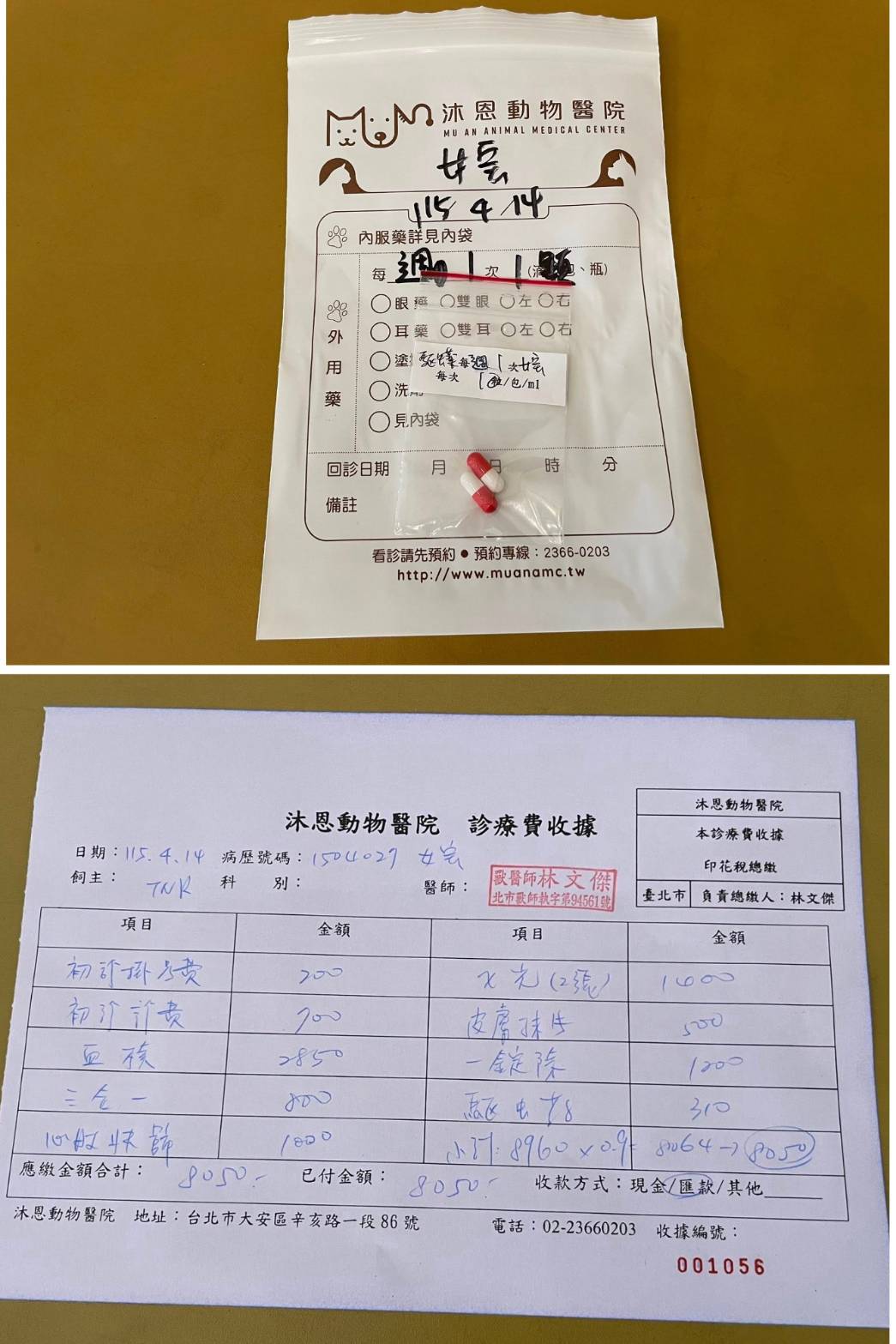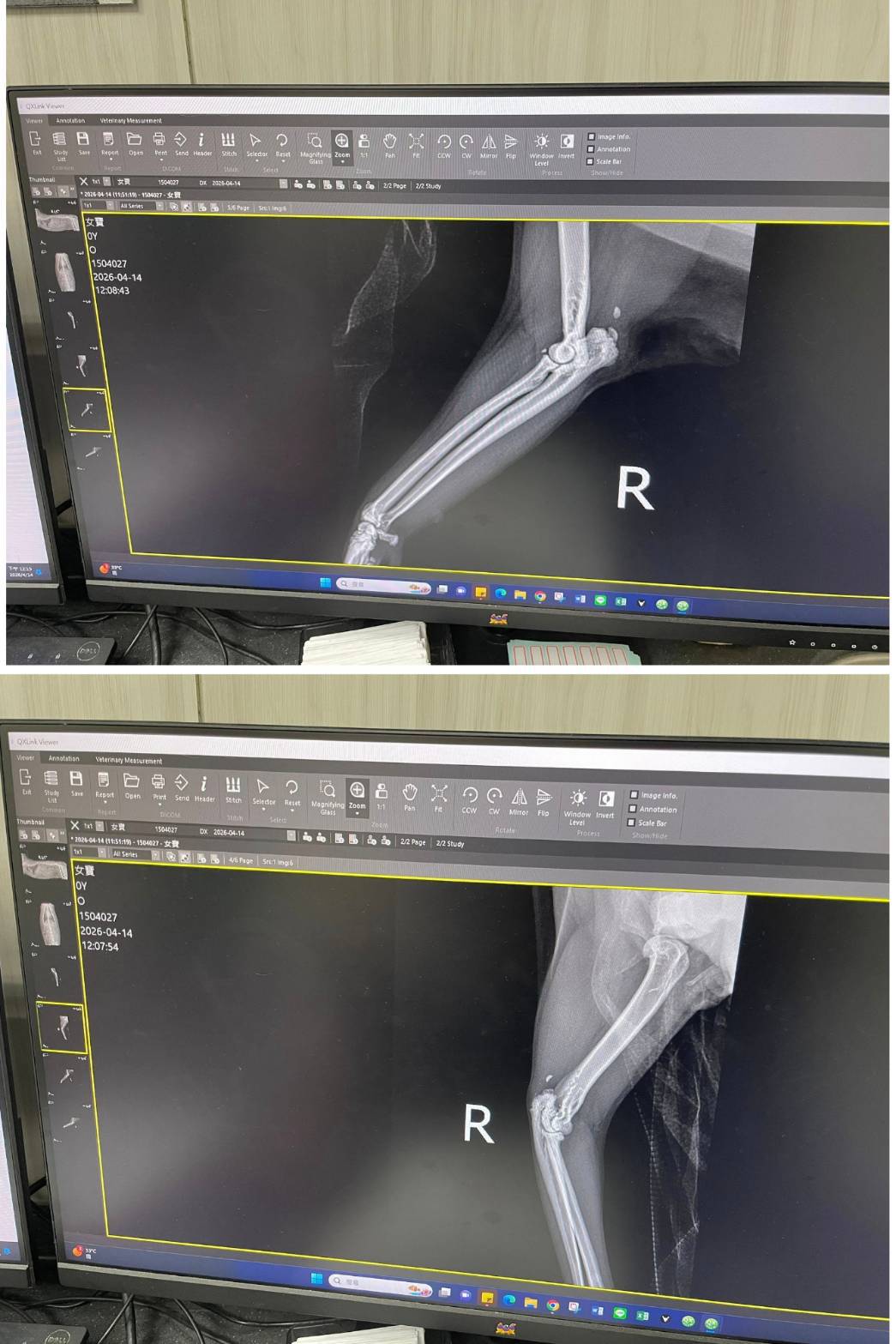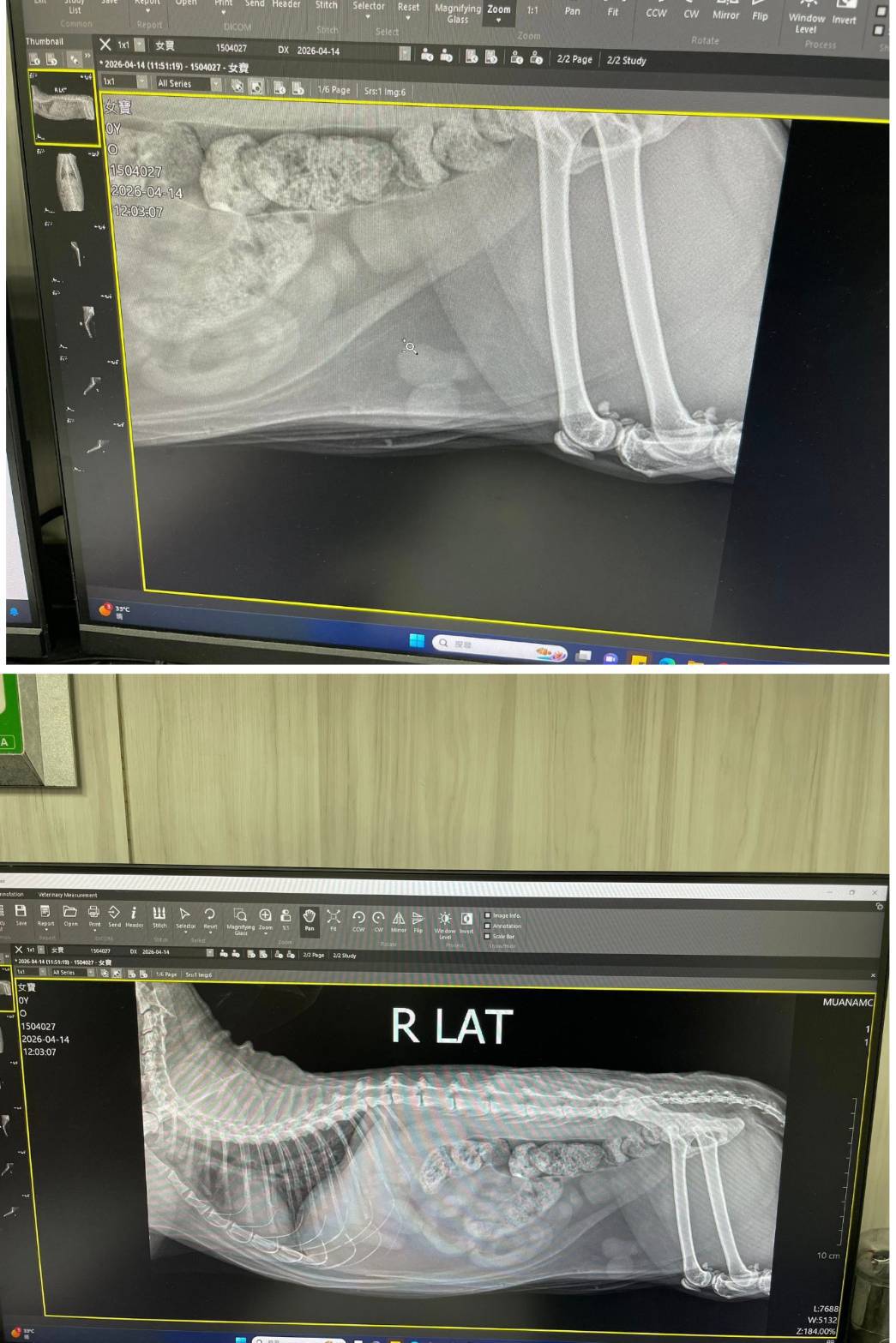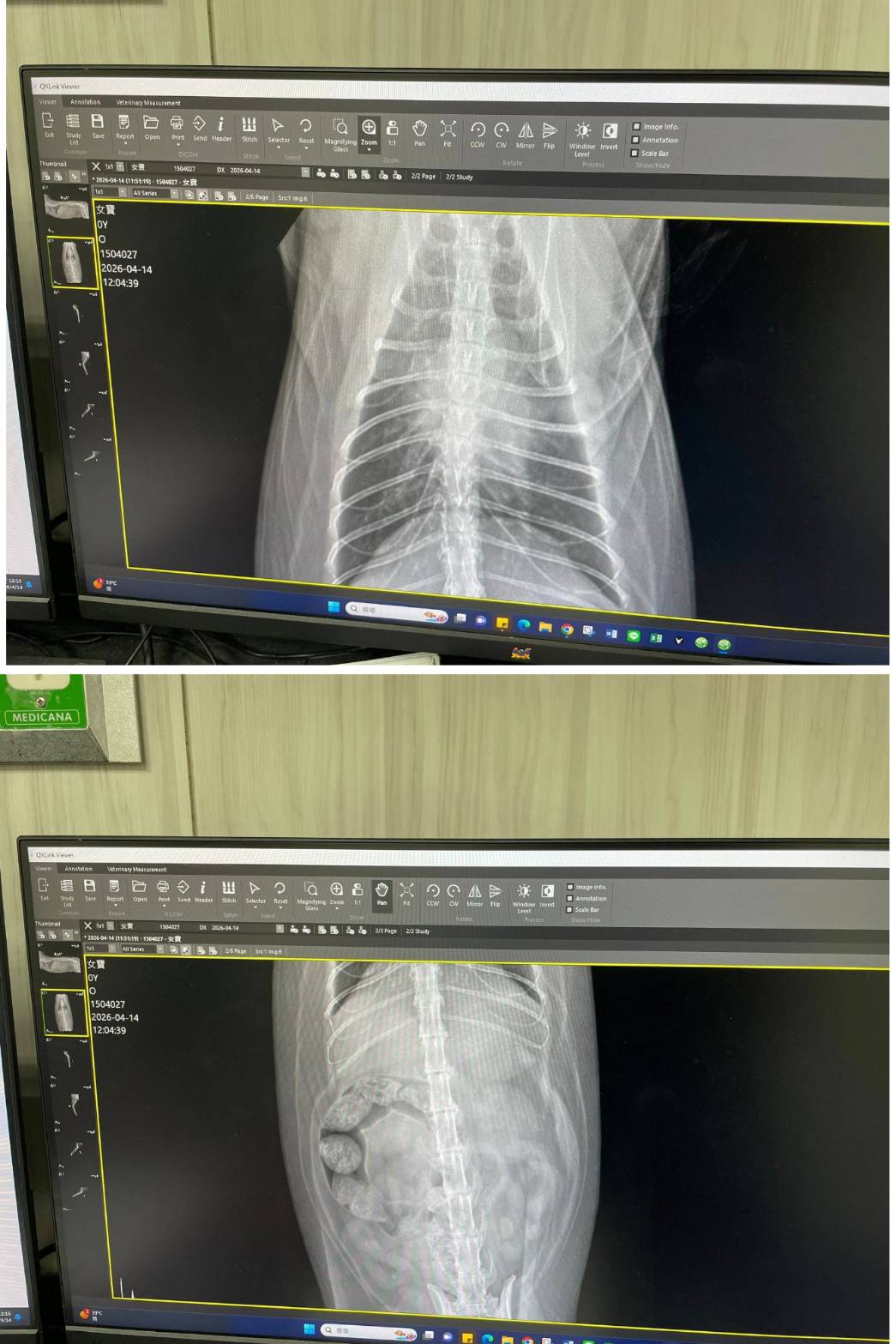 經X光檢查發現右前肢骨骼退化較嚴重,左邊也有一點骨骼退化;肺功能也是偏差;有牙周炎、牙齦萎縮所以齒根比較出來。X光有拍到兩顆東西,穿刺抹片檢查,淋巴細胞正常,淋巴結腫大。於醫院先點一錠除,並開立內用驅蟲藥,三個月後體外驅蟲需要再做一次。目前已於14日當日就醫後先行安置於協會幾日,因考量女寶年齡已大,汐止愛媽會帶回家中安置給女寶一個長久安穩的家。本筆醫助是女寶2026年4月14日於沐恩醫院看診的費用,包含血檢、X光、三合一、心臟快篩、皮膚抹片、一錠除滴劑及驅蟲藥。