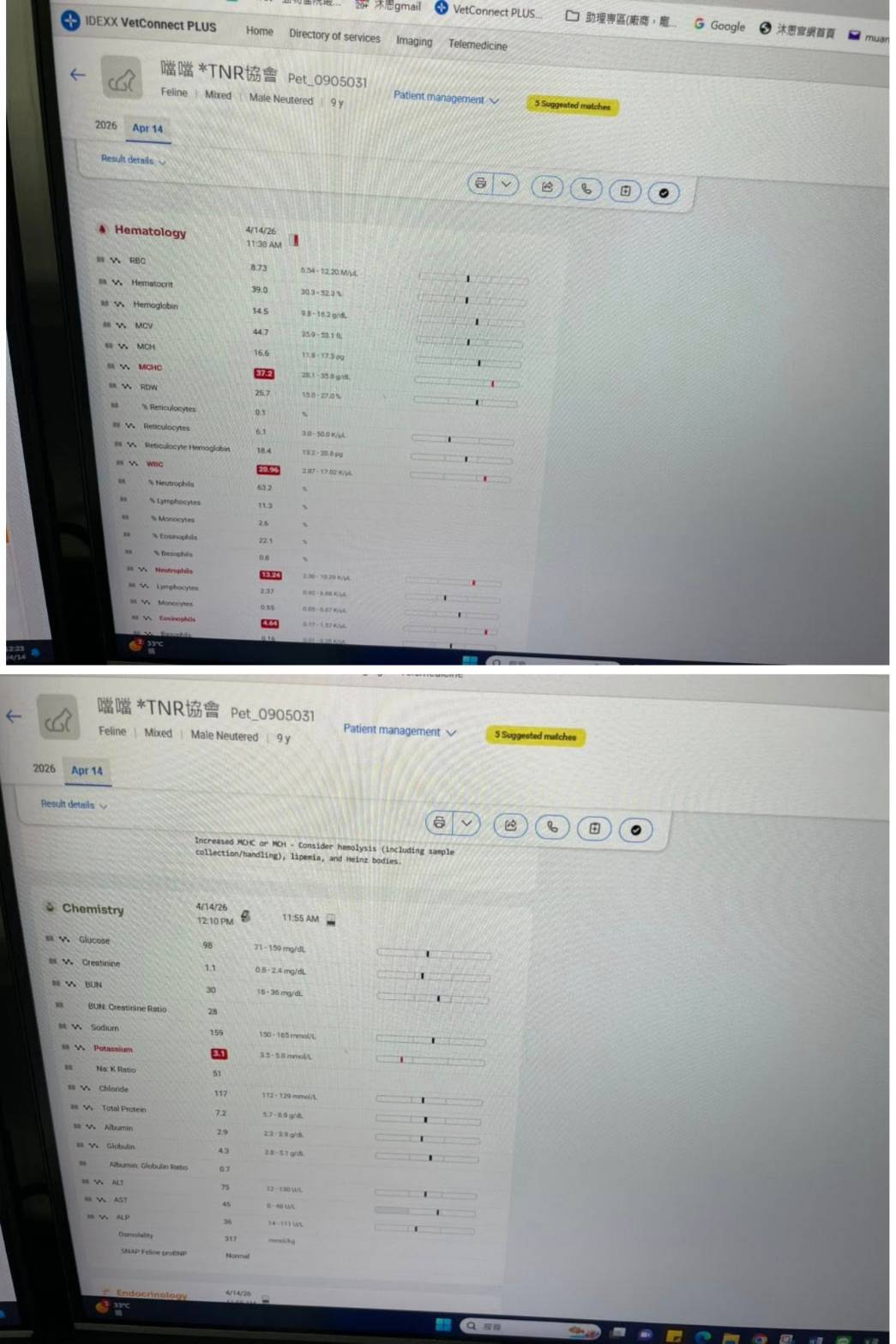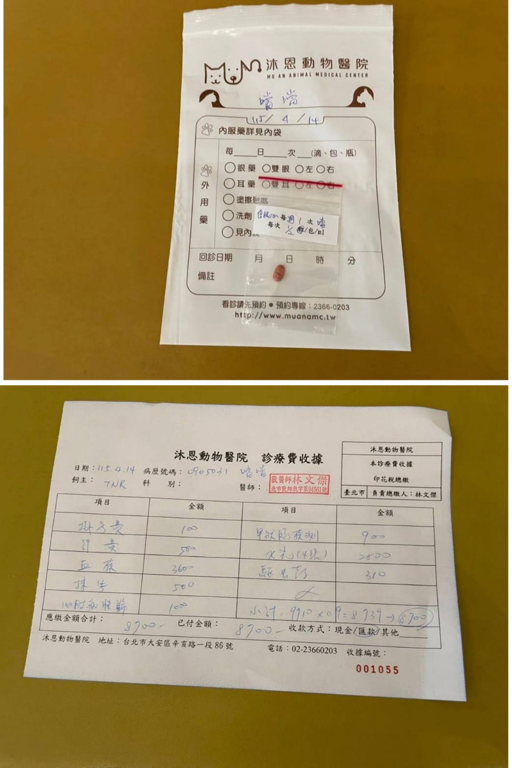 2026年四月因發現噹噹體型逐漸消瘦因此安排2026年4月15日於沐恩醫院就診,進行X光檢測無發現異常,但血檢結果發現鉀離子偏低,白血球及甲狀腺指數偏高,雖還未達到用藥標準,但嗜酸性球偏高懷疑是有寄生蟲問題,因此先吃驅蟲藥並且要再做糞檢檢查,需兩周後再回診確認。本筆醫助是噹噹2026年4月15日於沐恩醫院看診的費用,包含血檢、X光及用藥。