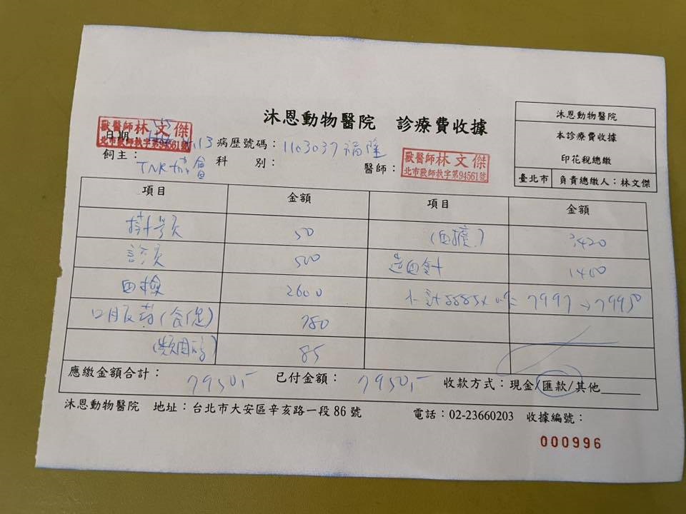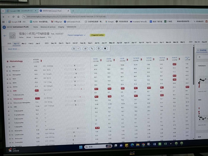 2026年3月2日於沐恩回診,血檢結果腎指數超標,其他暫無須特別留意的超標數值。為了使腎利磷更能配合吃飯,將飼料改為早晚班各放15g。再於2026年4月13日於沐恩就診,血檢結果腎指數及磷離子持續超標,因此需調整用藥及補液劑量,其他則暫無須特別留意的超標數值。醫師表示腎指數持續超標,因此食物部分勿放凍乾,飼料改早晚班各放18克。本筆醫助是福隆2026年4月13日於沐恩醫院的醫療費用,包含看診血檢及用藥。