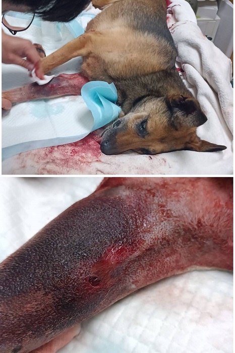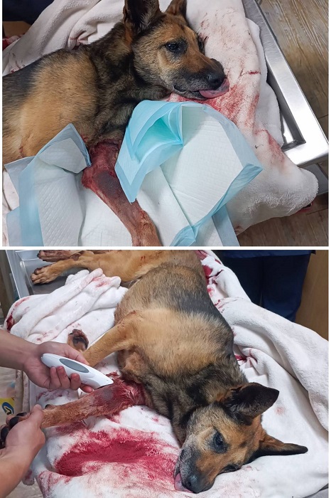 ,左前腳去刺或勾到異物,導致血流不止,緊急送到醫院鎮定止血,感謝現場排隊貓狗飼主,先讓飛狼醫療,有跟醫師說明,飛狼很親人沒攻擊性
