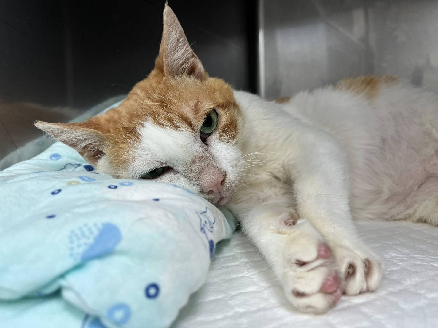 後又於2025年11月24日回診,白血球指數可能跟他肺部之前感染有關係,不大影響。但腎指數有點高,需吃腎處方飼料。目前已會自行翻身但仍注意定時查看避面免過長時間都躺同一側造成褥瘡。