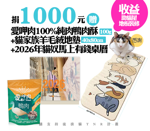 候補人員: 說明: 捐1000元贈愛呷肉100%純肉鴨肉酥(100g)+貓家族羊毛絨地墊(40x80cm)+2026年貓奴馬上有錢桌曆