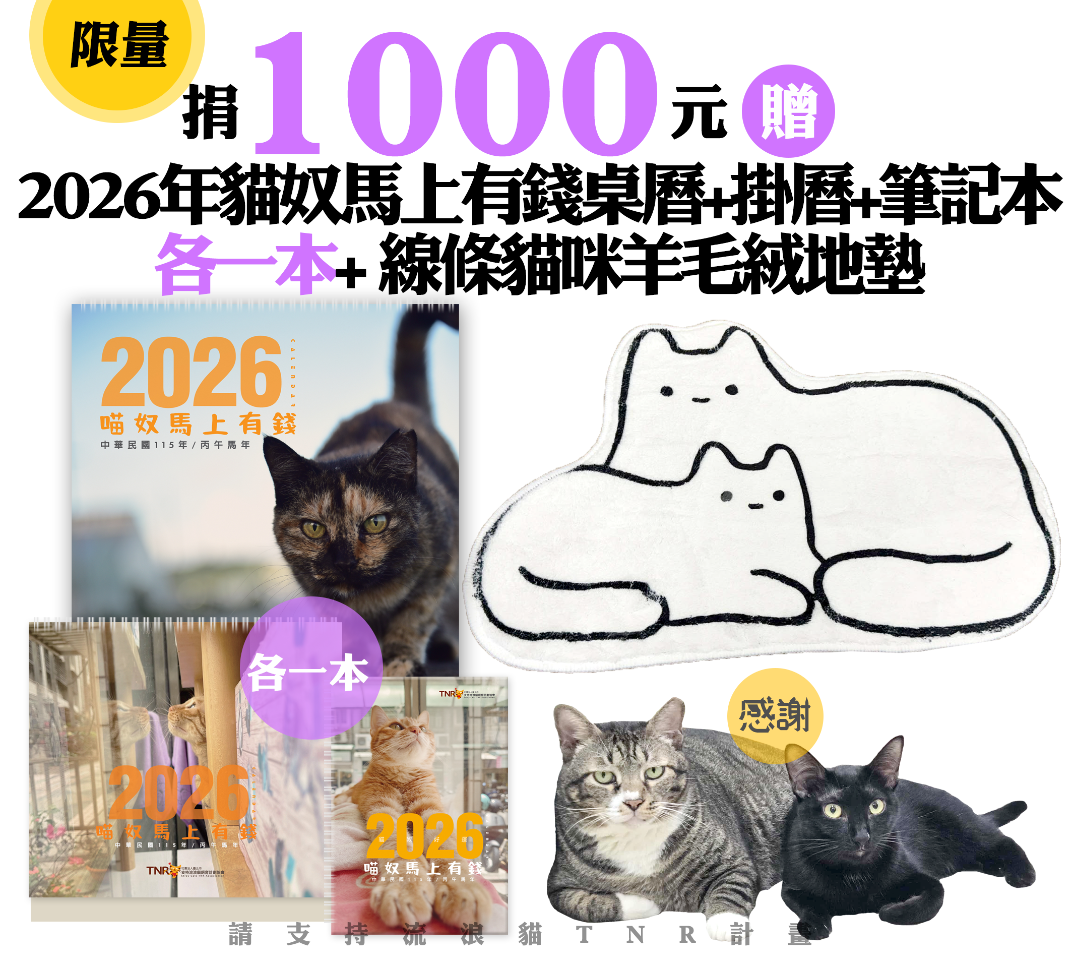 贈品名稱: 限量!捐1000元贈2026年貓奴馬上有錢桌曆+掛曆+筆記本各一本+線條貓咪羊毛絨地墊 贈品總數: 20人 每人捐款金額: 1000元 已報名名額: 0 尚需求名額: 20 報名人員: 候補人員: 說明: 限量!捐1000元贈2026年貓奴馬上有錢桌曆+掛曆+筆記本各一本+線條貓咪羊毛絨地墊